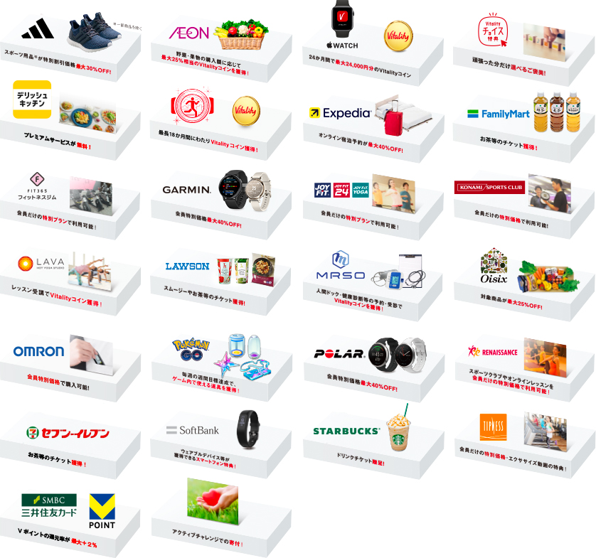 ●上記の内容はVitality健康プログラムの主な特典(リワード)です。特典内容・サービス提供開始時期の詳細につきましては「特典(リワード)」ページにてご確認ください。