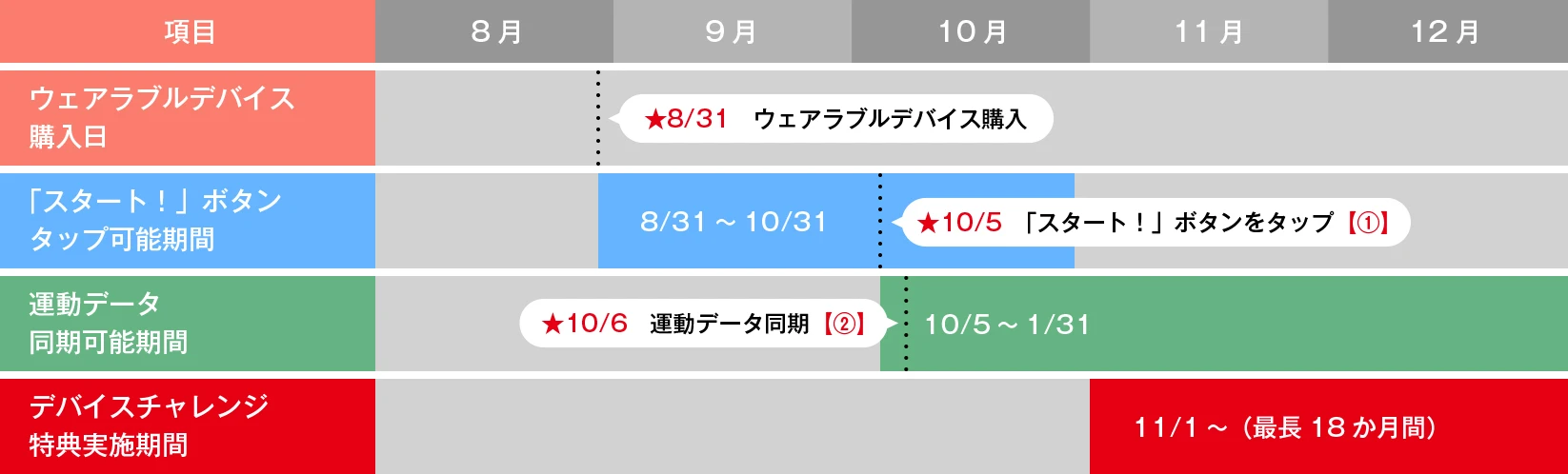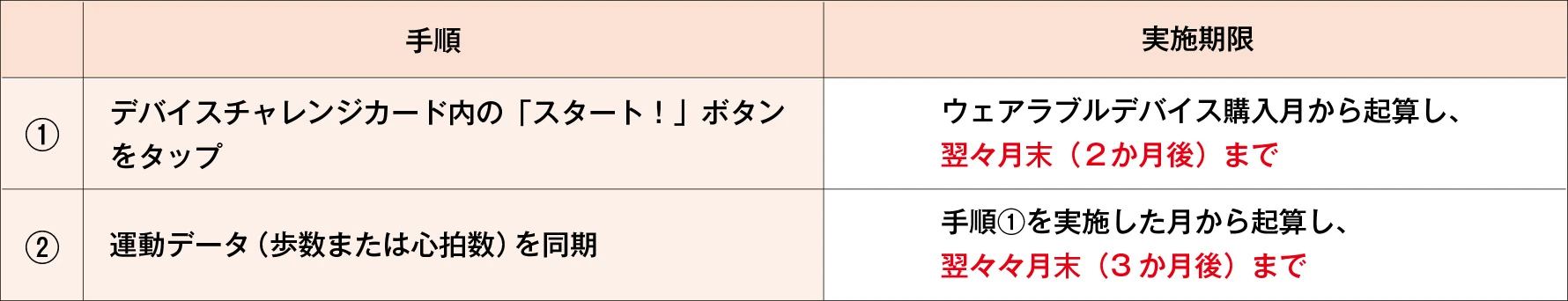 ウェアラブルデバイスを購入後、所定の期間内に以下の手順①・②を実施することで特典が開始します。