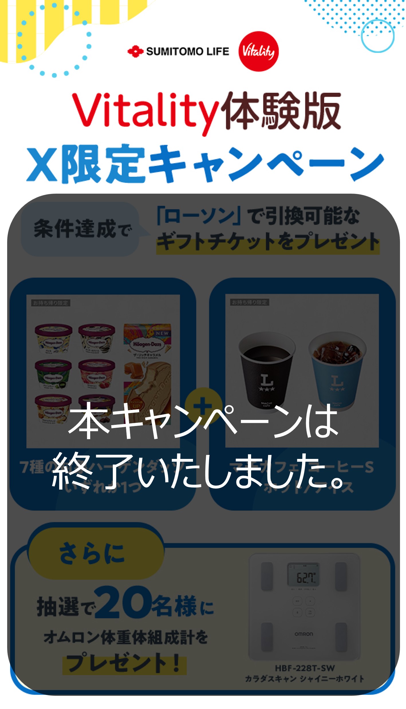- ・Vitality体験版に登録されているメールアドレスあてに、4/10(金)頃にローソンで使用できるギフトチケットをメールで配信いたします。引換期限はメールをご確認ください。