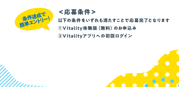 - ・Vitality体験版申込時に入力された住所あてに賞品を発送いたします。住所の入力不備や転居等による住所変更等の事由により賞品がお届けできない場合、当選を取り消しさせていただくことがあります。