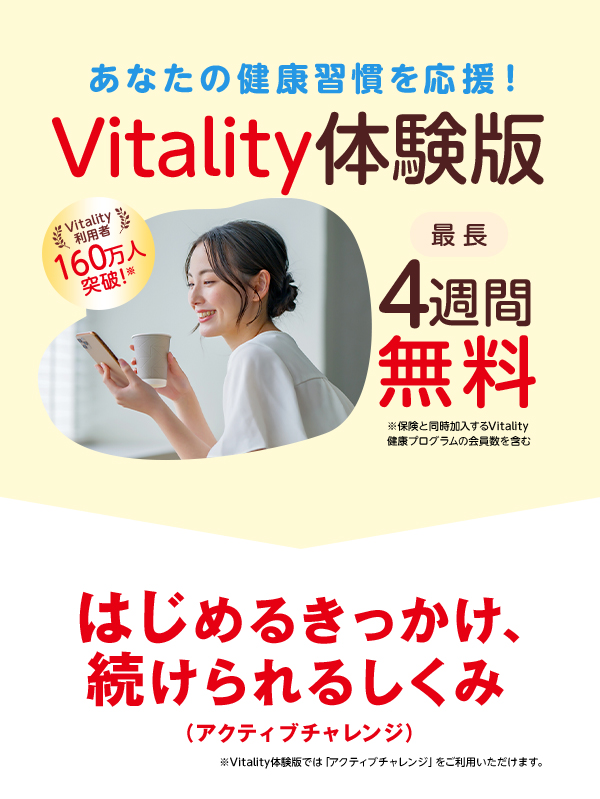 - ・Vitality健康プログラム(Vitality体験版)の内容(ポイント獲得の対象となる健康増進活動、健康増進活動を通じて付与されるポイント数、提供される特典(リワード)の内容等)は、2026年3月現在のものであり、将来変更することがあります。
