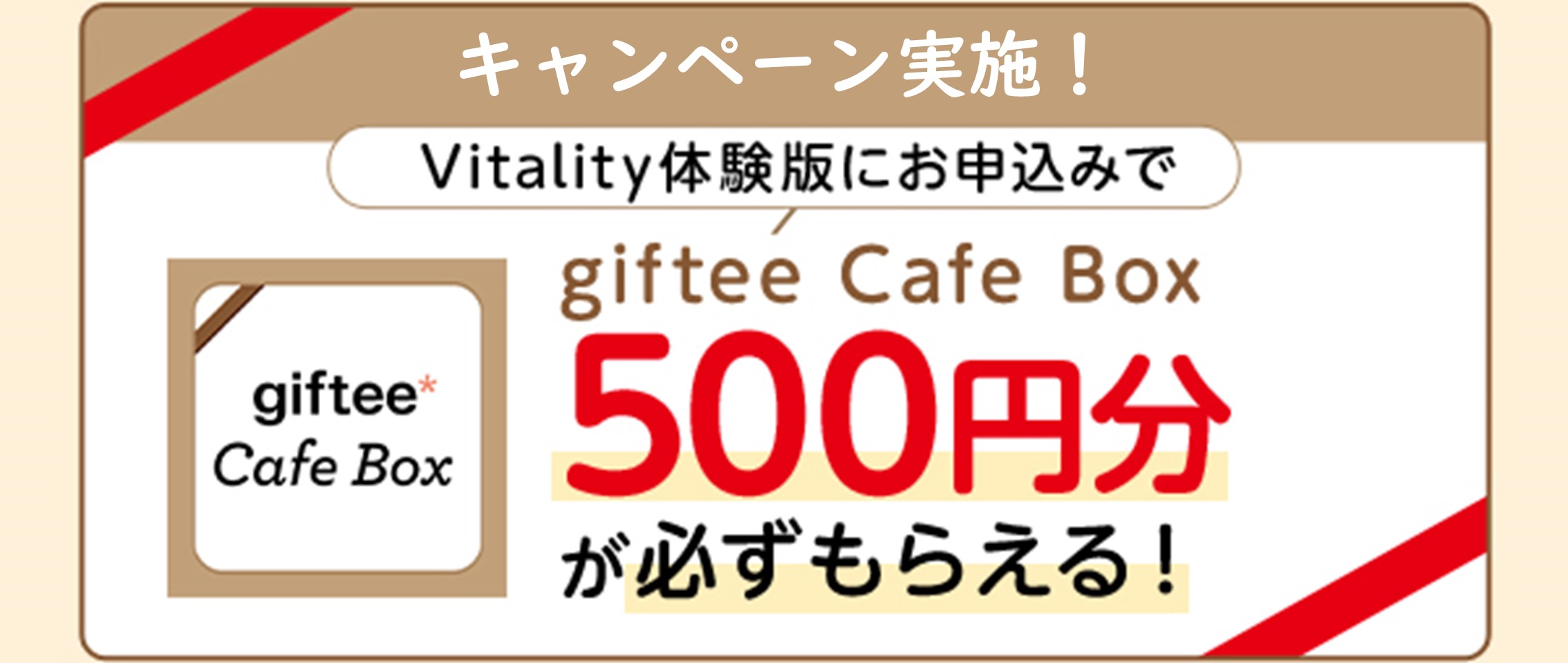 - ・Vitality体験版に登録されているメールアドレスあてに、申込後2週間程度以内(年末年始を除く)にgiftee Cafe BoxのURLを記載したメールを配信いたします。引換期限はメールをご確認ください。